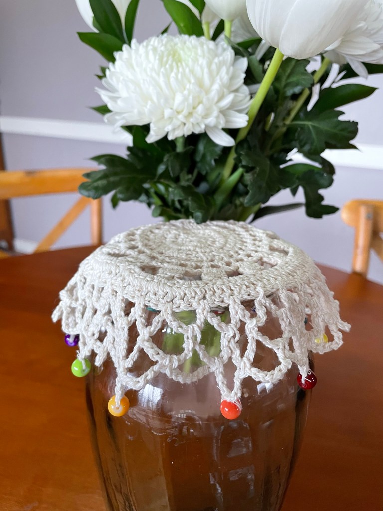 We had another customer who asked us if we could make old fashioned jug covers, you know, the ones that look like round crocheted doilies with beads around the edge. We said, “Why not?”. Two have clear glass beads, one has coloured glass beads and one has coloured stone beads. We are looking to make more of these but find it hard to source nice glass beads. So if anyone has any hiding away in a cupboard, we are very grateful for donations.