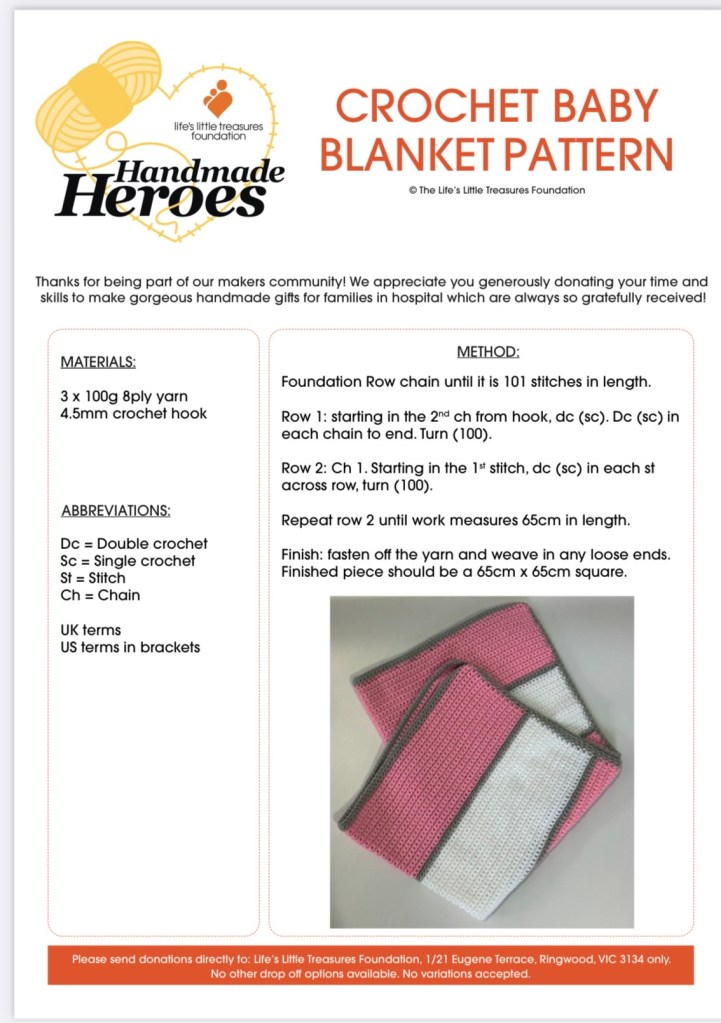 During our break we posted some of our finished baby blankets to Life’s Little Treasures Foundation, an organisation that supports premature babies. They are quite prescriptive with their blankets for health and safety reasons. We are still making them and invite others to join us. See below for the instructions and just drop them into us when finished. We hope to post more next school holidays.